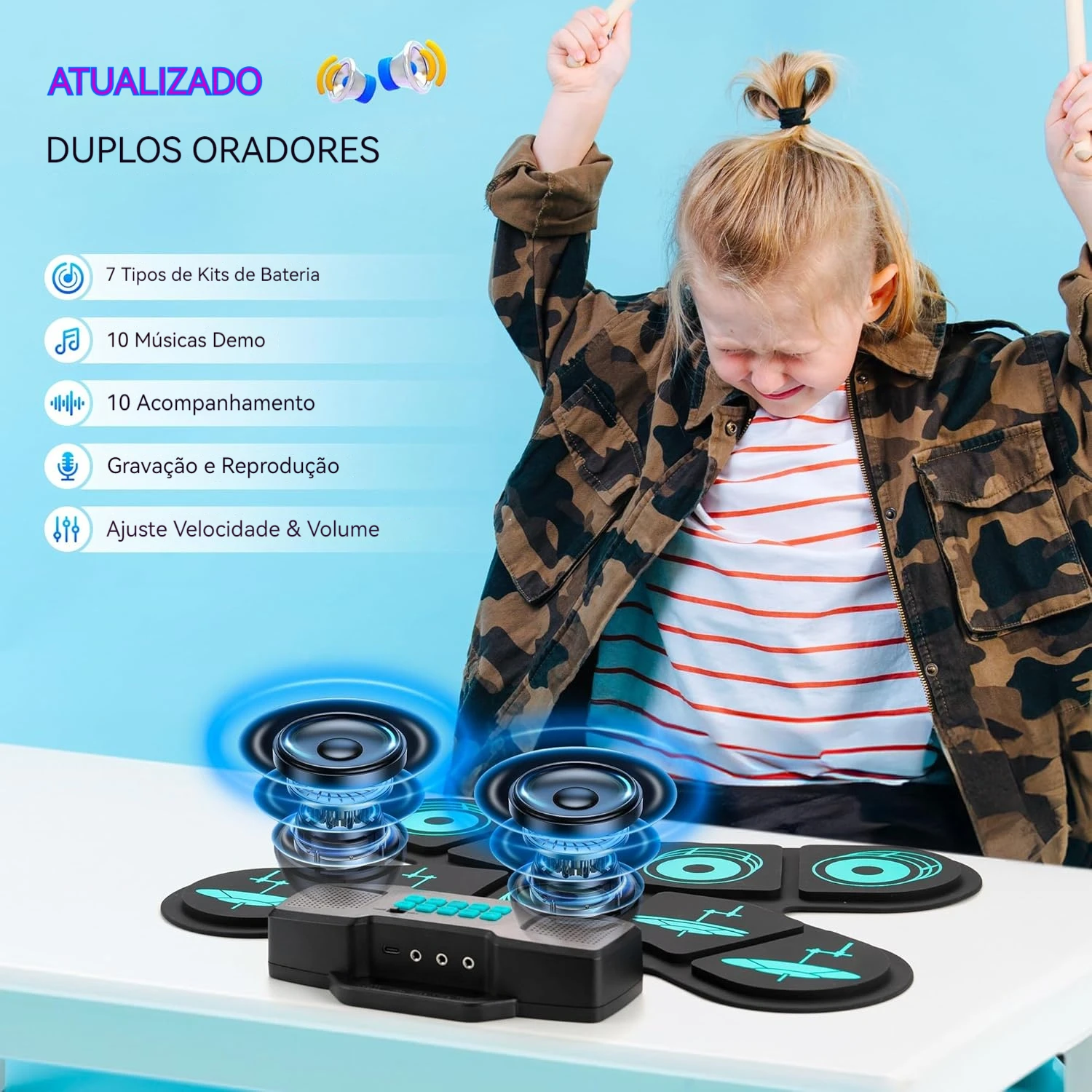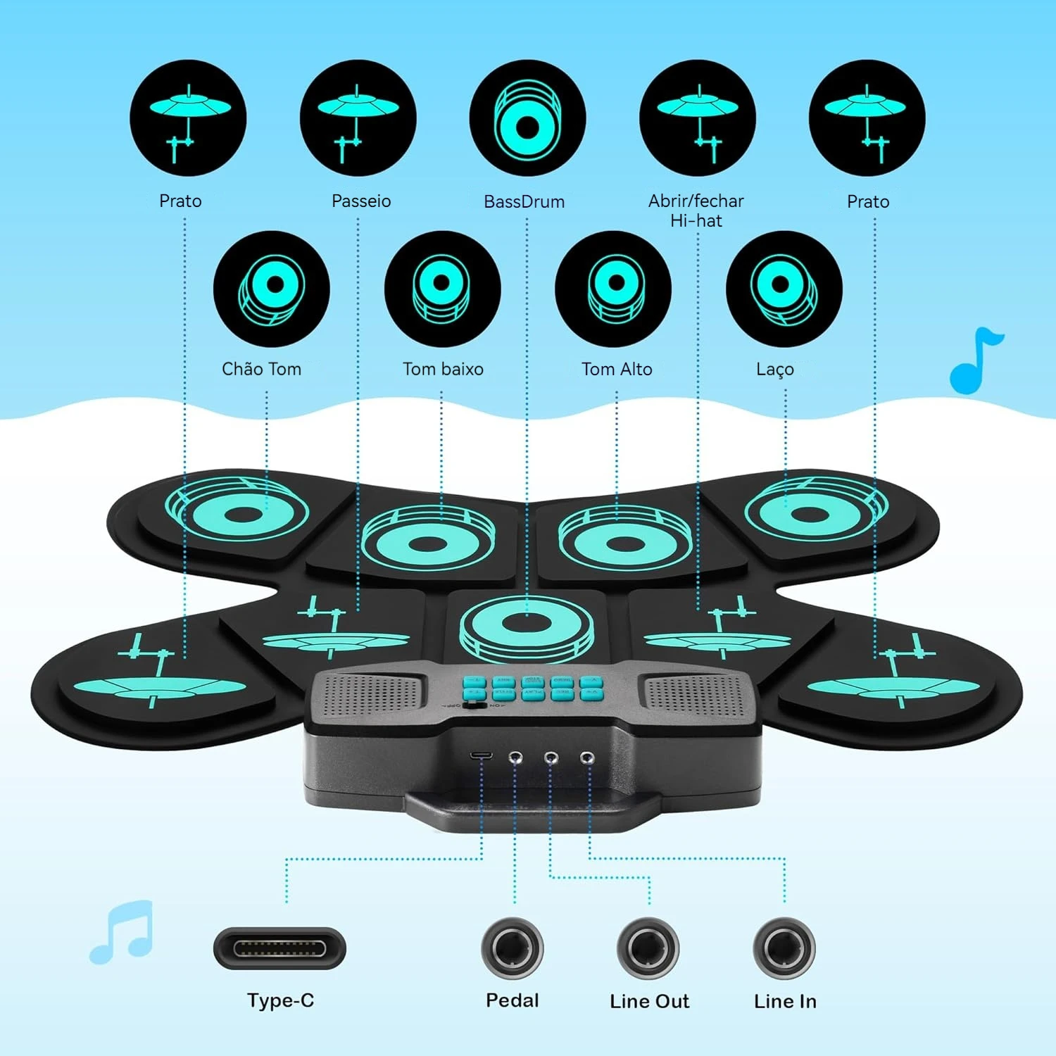 O Conjunto de Tapete de Bateria Eletrônica Portátil é perfeito para iniciantes. Com 9 pads e alto-falante duplo, proporciona uma experiência sonora incrível. Além disso, é leve e fácil de transportar.