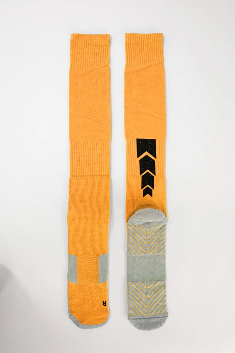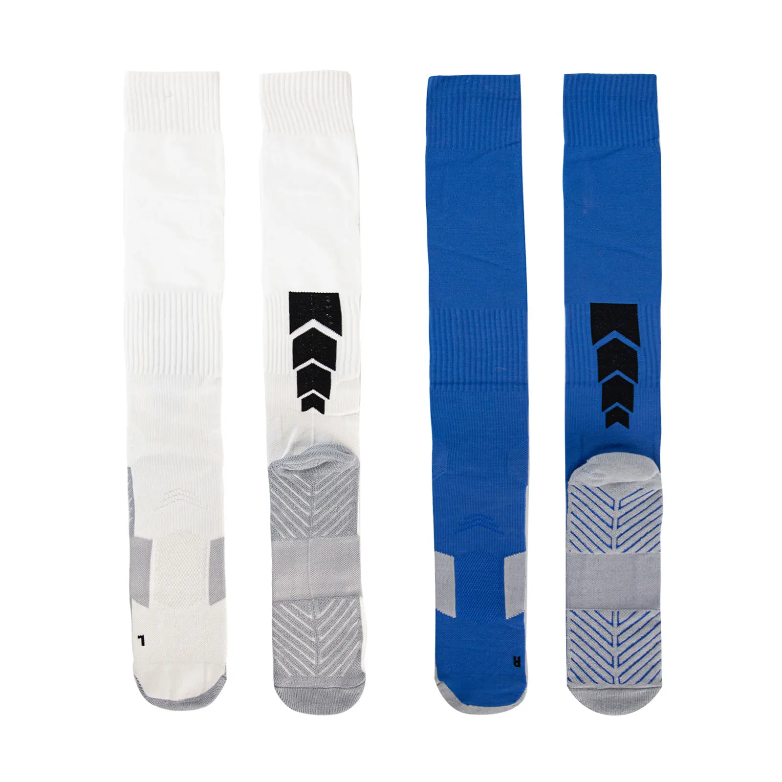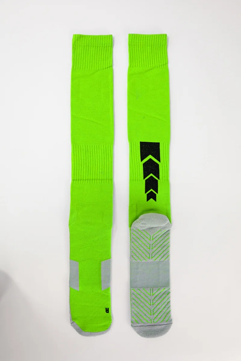 Consequentemente, as meias possuem fundo antiderrapante, garantindo uma aderência eficaz durante jogos intensos. Assim sendo, você não precisará se preocupar com escorregões que possam prejudicar seu desempenho. Por exemplo, o comprimento da meia é projetado para cobrir a parte superior do joelho, proporcionando um ajuste ideal e evitando que as meias deslizem durante a atividade física.