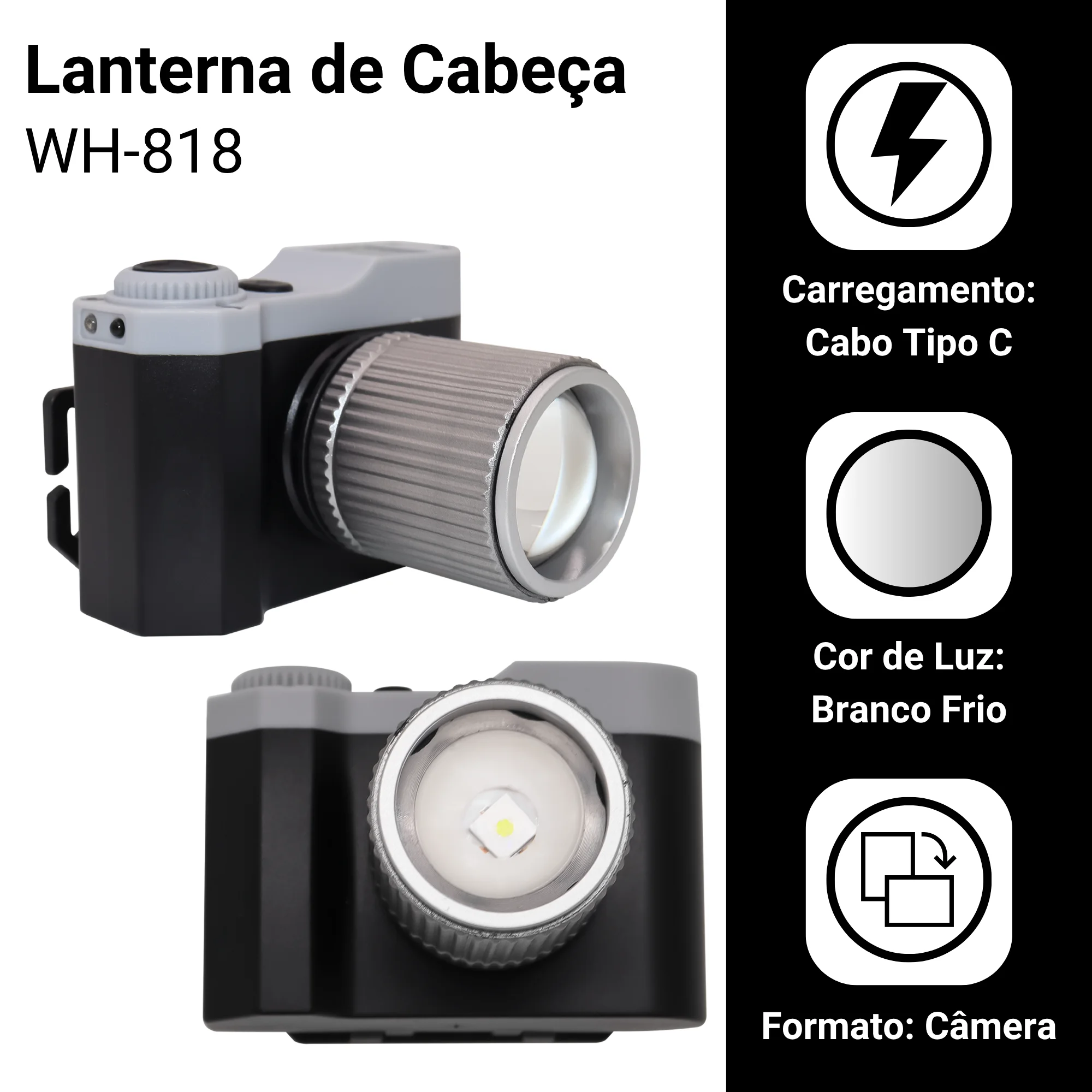 A lanterna de cabeça LED Recarregável WH818 é uma ferramenta essencial para aqueles que buscam praticidade e eficiência em iluminação. Além disso, seu design inovador permite que ela funcione como uma câmera, oferecendo um zoom focal que ajusta a direção da luz de acordo com a necessidade do usuário.