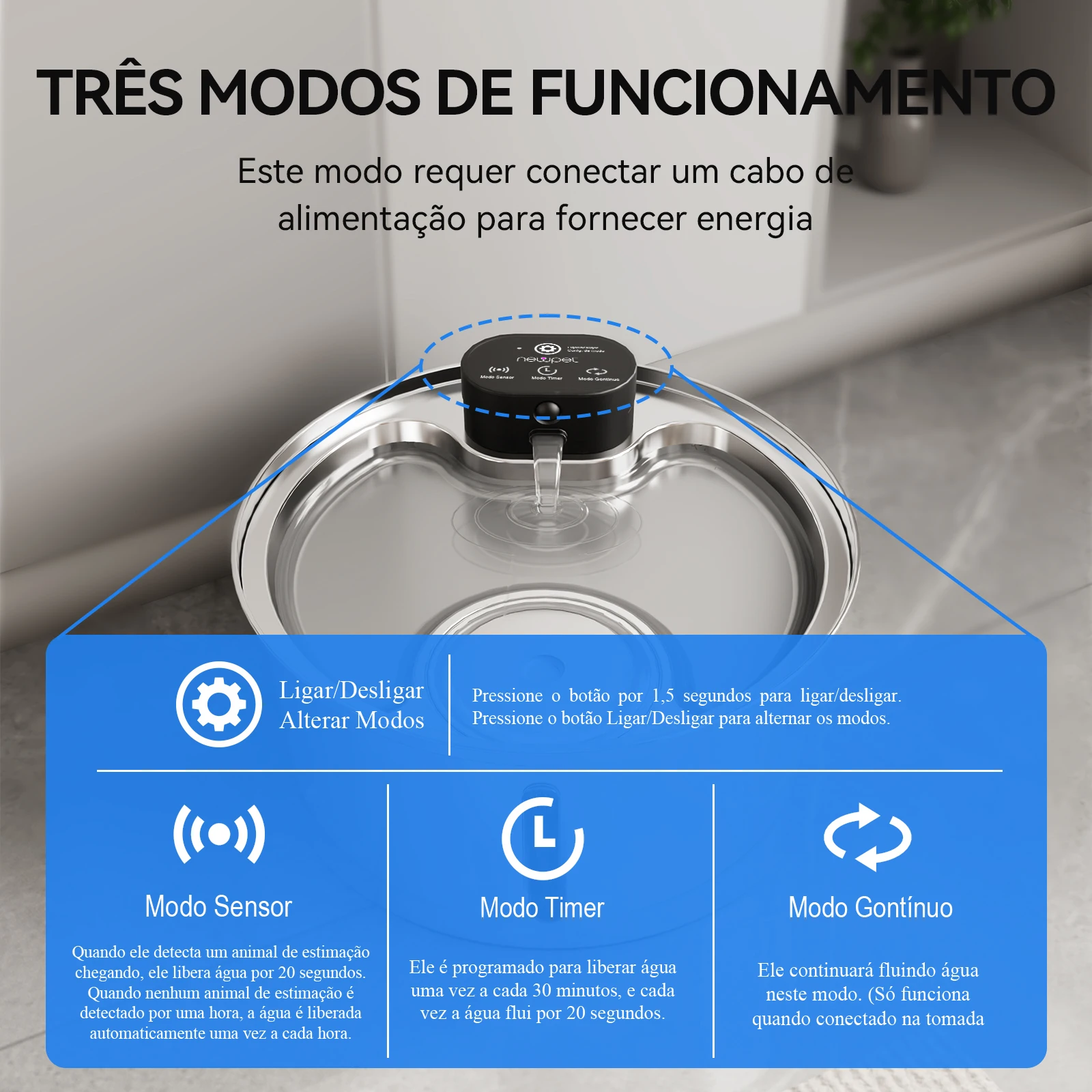 Este bebedouro inovador conta com um sistema sem fio que é alimentado por uma bateria de 5000mAh, o que garante uma longa duração e praticidade de uso. Assim sendo, você poderá utilizar o bebedouro em diferentes ambientes, sem a necessidade de estar próximo a uma tomada. O sensor 2 em 1 presente neste modelo proporciona um funcionamento automático, garantindo que a água seja liberada conforme a necessidade do seu pet. Portanto, a tecnologia envolvida proporciona um cuidado extra e uma experiência única para o seu animal.